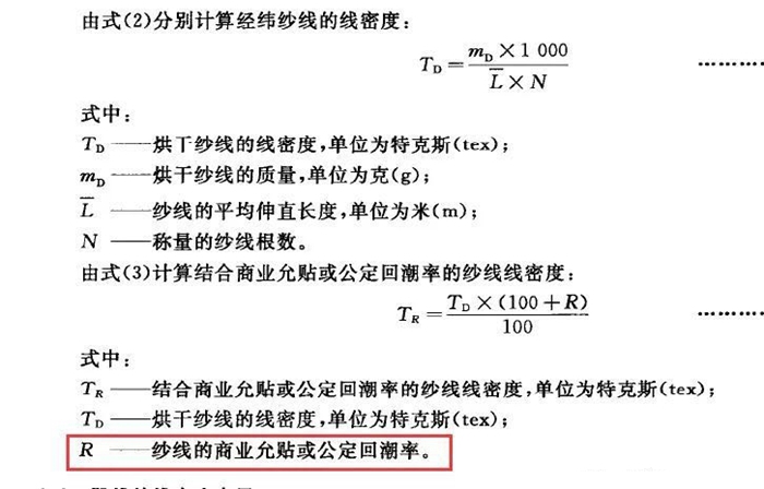 GB/T 29256.5-2012《紡織品機(jī)織物結(jié)構(gòu)分析方法第5部分:織物中拆下紗線線密度的測定》中,計算紗線線密度: