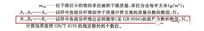 例如:方法標(biāo)準(zhǔn)GB/T 35443-2017《紡織品 定量化學(xué)分析 海藻纖維與某些其他纖維的混合物》中第9章節(jié):海藻纖維標(biāo)準(zhǔn)回潮率為20.7%。