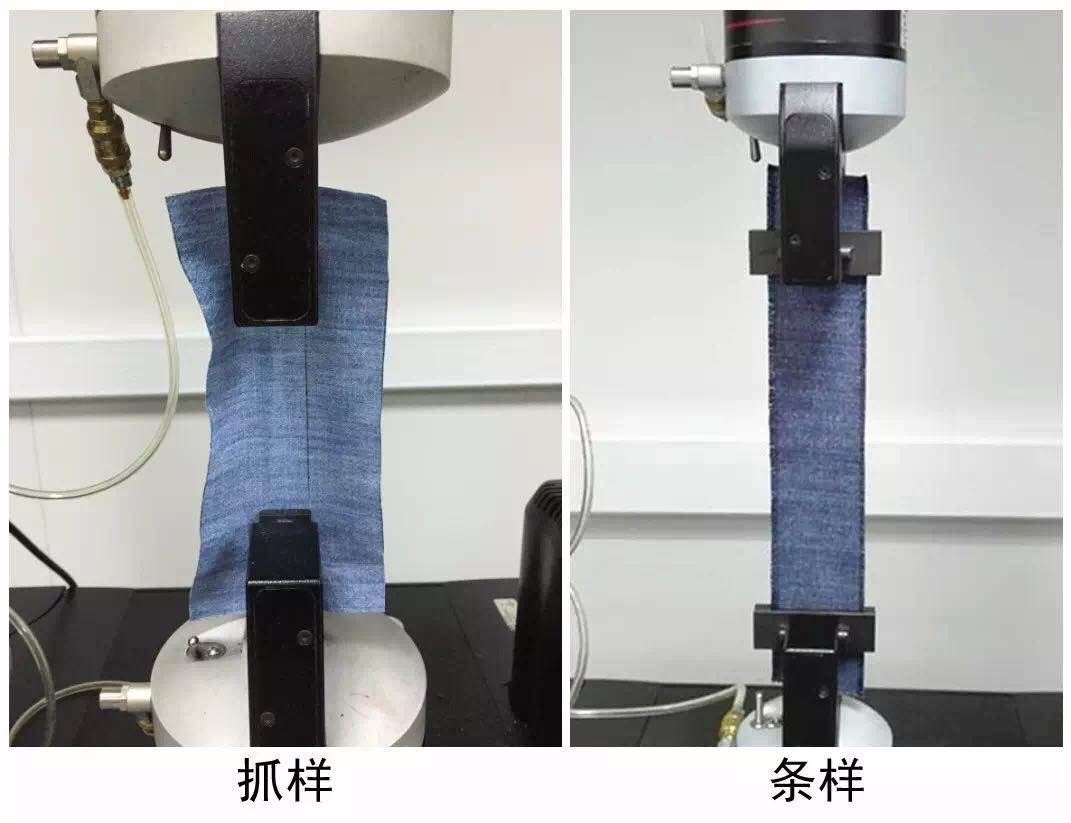 2. 抓樣試驗:試樣寬度方向的中央部位被夾持器夾持的一種織物拉伸試樣。