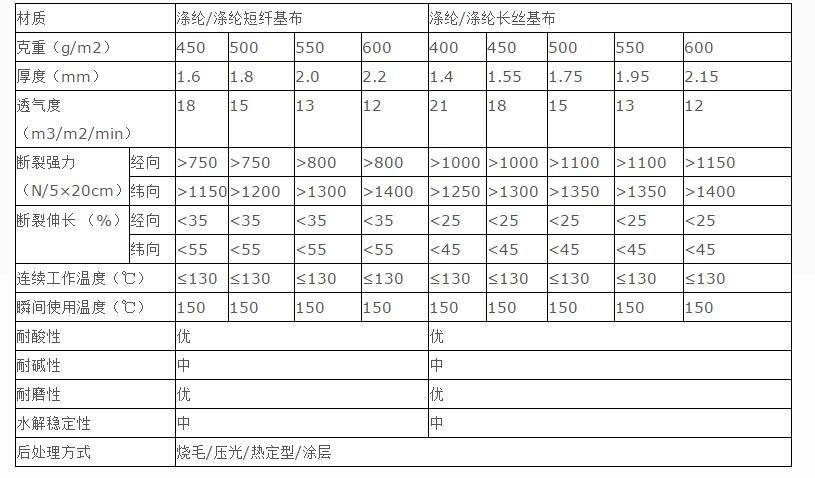 滌綸優(yōu)質(zhì)細旦大化纖維絲,以先進設(shè)備生產(chǎn)滌綸(聚酯)纖維針刺過濾氈,可將多種纖維均勻定量混合,再用多臺混開棉機組及梳理機組利于纖網(wǎng)之間不同纖維間層裝復(fù)合、梯度變換。該產(chǎn)品除具有普通氈類濾布特有的空隙度高、透氣性好、集塵效率高、使用壽命長等優(yōu)點外,因其耐溫等級適中,瞬間可達150℃,耐酸、耐堿適中的特點外而且具有非常好的耐磨性,故它是氈類濾材中使用量大的一個品種。