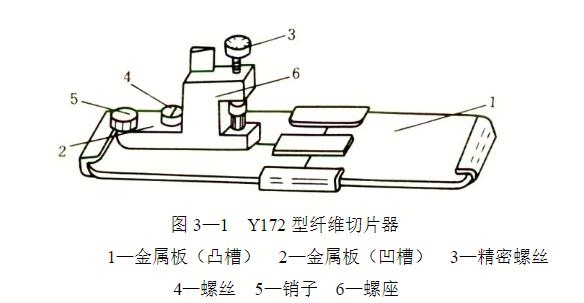 Y172哈氏切片器的結(jié)構(gòu)如下圖所示,它主要有兩塊金屬底板,左底板上有凸槽,兩塊底板嚙合時(shí),凸舌和凹槽之間留有一定大小的空隙,試樣就放在空隙中??障兜恼戏?,有與空隙大小相一致的小推桿,用精密螺絲控制推桿的位置。切片時(shí),轉(zhuǎn)動(dòng)精密螺絲,推桿將纖維從底板的另一面推出,推出的距離(即切片的厚度)由精密螺絲控制。