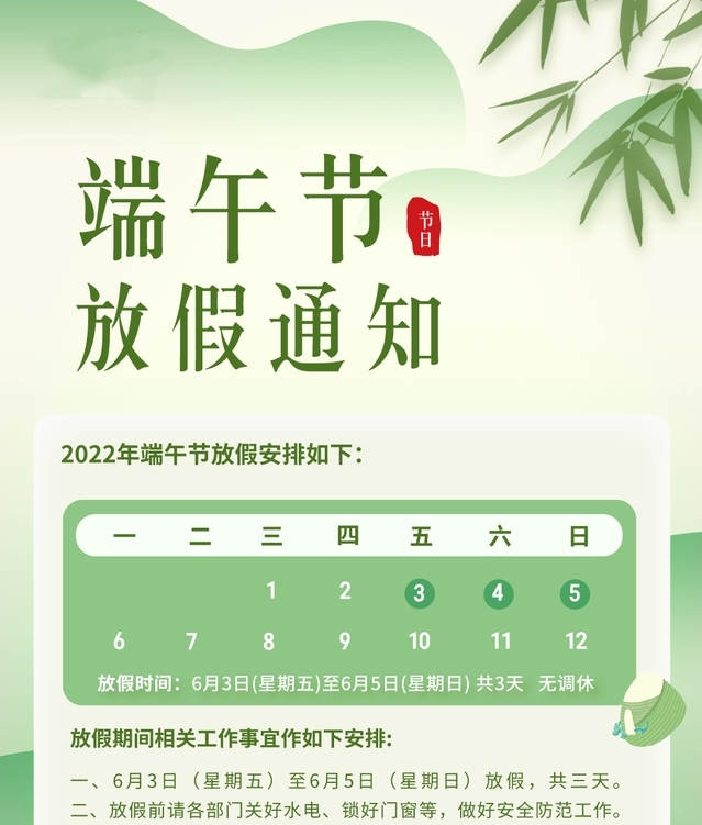 一、放假時間:2022年6月3日至6月5日共3天。